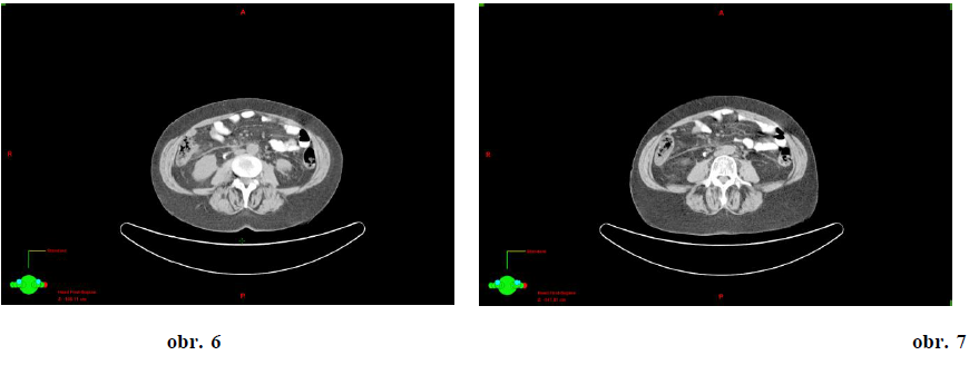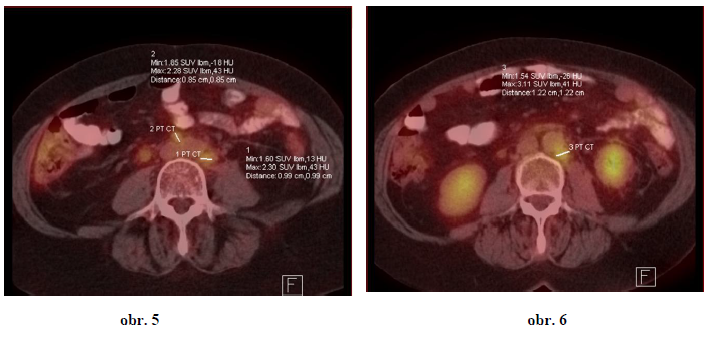 26. 7. 2013 PET/CT - ložiska hypermetabolismus glukózy svědčící pro viabilní neoplasii dnes nenacházíme – CR (obr. 6, 7)