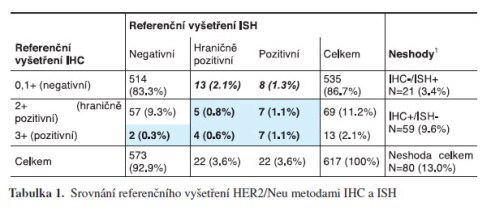 Iniciální IHC vyšetření exprese HER2 bylo skóre 0 v 62,2% a skóre 1+ v 37,8% případů. IHC vyšetření v referenční laboratoři bylo shodné s primárním vyšetřením v 535 (86,7%) případů. Z 82 (13,3%) neshodných případů bylo 13 nádorů (2,1%) HER2 silně pozitivních (3+) a 69 (11,2%) slabě (hraničně) pozitivních. Z těchto 69 nádorů však jen 12 (1,9%) vykazovalo amplifikaci pomocí ISH, zbylých 57 (9,3%) bylo ISH negativních. Z celkového počtu 617 nádorů tedy byla klinicky signifikantní falešná negativita vyšetření v primární laboratoři prokázána v 25 případech (4%) – detaily viz tabulka 1.