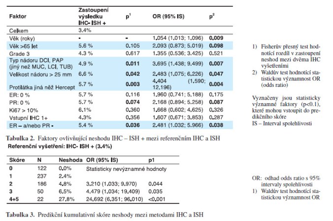 Zastoupení pacientek s nádory IHC-/ISH+ není natolik vysoké, aby bylo efektivní testovat pomocí ISH všechny karcinomy prsu bez ohledu na výsledek IHC, nebo současné testování pomocí IHC zcela nahradit in situ hybridizací. Zavedení ISH testování by však mělo význam u karcinomů jiných než lobulárních, mucinózních a tubulárních, jejichž velikost je větší než 25 mm, jsou diagnostikovány u starších žen (zejména > 65 let) a vykazují ztrátu exprese ER a/nebo PR. U podskupiny pacientek, které vykazují 3 z těchto faktorů, dosahuje zastoupení případů IHC-/ISH+ 13.0%, v případě kumulace 4 nebo 5 zmíněných faktorů, je výskyt IHC-/ISH+ fenotypu dokonce 27.8% (viz tabulka 3).