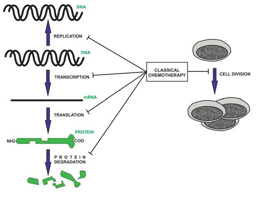 Konvenční (necílená) chemoterapie byla zavedena do klinické praxe na základě preklinických a klinických zkušeností s protinádorovou účinností určitého přípravku u různých typů nádorových onemocnění. Jen zřídka bylo cytostatikum určeno k léčbě jednoho druhu nádoru. Používaná cytostatika lze označit jako „širokospektrá“. To vyplývá z mechanismu jejich účinku, znázorněného na obrázku 1.