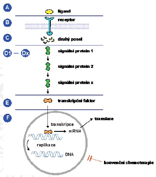 Obrázek 3: Obecné schéma přenosu signálu z membránového receptoru do nitra buňky a různé úrovně možného terapeutického zásahu u aberantně aktivovaných drah.