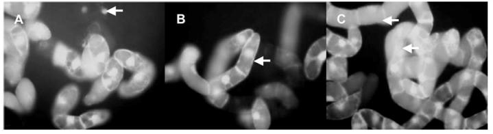 „apoptic-like bodies" (vyznačeno na fotografiích šipkami) v různých