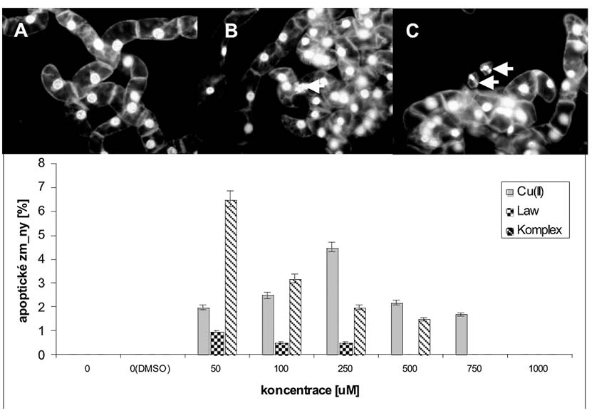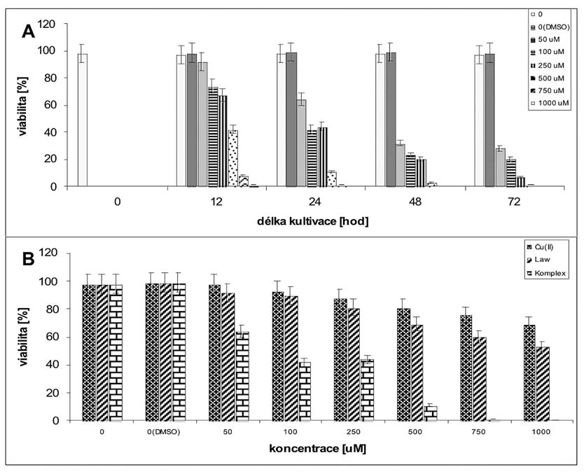 Významnou vlastností naftochinonů je jejich cytotoxicita. Ta je založena na několika paralelně probíhajících mechanizmech, mezi které patří generování reaktivních forem kyslíku poškozujících veškeré biomolekuly, aktivace proapoptických a down-regu-lace antiapoptických genů vedoucích v případě živočišných buněk k apoptóze, stejně jako interakce s biosyntézou nukleových kyselin, inhibice topoizomeráz i interakce s vlastní DNA, zejména interkalace (Babula et al.; Kiran Aithal et al.). Zajímavou možnost modifikace biologických účinků naftochinonů představuje příprava jejich derivátů a komplexů, jak již bylo prokázáno v případě dalších sekundárních metabolitů, ale také vlastních naftochinonů (Hashem et al.; Hernandez-Molina et al.; Chang et al.; Kelkar et al.; Kumbhar et al.). Zajímavou možnost obměny a vystupňování biologických účinků představuje příprava komplexů sekundárních metabolitů s ionty těžkých kovů. Jako zajímavé se jeví komplexy kvercetinu s mědnatými ionty, které vykazují schopnost přímé interakce s DNA a potažmo tedy výrazné cytotoxické vlastnosti (Tan et al.). Z tohoto důvodu byly tedy zcela nově připraveny různé komplexy naftochinonu lawsonu (2-hydroxy-1,4-naftochinon) s mědí, které byly dále charakterizovány z pohledu jejich biologických aktivit. Pro prescreeningové studie, stejně jako studie fytotoxicity, je velmi vhodná buněčná suspenzní kultura tabáku BY-2, přirovnávaná k HeLa buňkám (Nagata et al.). Výsledky získané pomocí této buněčné kultury vykazují v řadě ohledů korelaci s výsledky získanými na buňkách živočišných, nenádorových i nádorových (Babula et al.; Babula et al.; Smejkal et al.). Cílem předložené práce je tedy studium cytotoxicity jednoho z komplexů lawsonu a mědi (jako Cu2+) na modelové buněčné suspenzní kultuře BY-2.