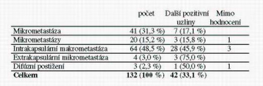 Z tabulky vyplývá, že při přihlédnutí k chybě malých čísel je pravděpodobnost postižení nesentinelových uzlin úměrná masivnosti nálezu v sentinelové uzlině. Nicméně i při nálezu jednotlivé mikrometastázy v sentinelové uzlině je pravděpodobnost metastatického nálezu v další uzlině poměrně vysoká.