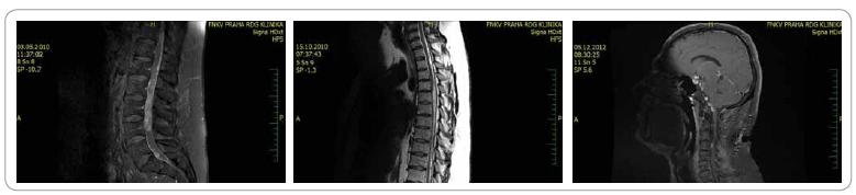 Muž, 38 let, zedník, aktivní sportovec, RA a OA negativní. V 5/2010 hospitalizován na neurologii pro progredující paraparézu DK se sfinkterovými obtížemi, KI 70 %. Na MRI L páteře zjištěna objemná Tu infiltrace L2-L4 a L5—S1. Provedena subtotální extirpace, histologicky oligodendrogliom G II. Pro nejednoznačný histologický popis provedeno druhé čtení, nález uzavřen jako atypický meningeom G II. Pooperačně těžká paraparéza DK, syndrom kaudy s inkontinencí, KI 40 %. Mezioborovým neuroonkologickým týmem indikována pooperační radioterapie Th12—S3, paliativní záměr při celkově špatném klinickém stavu, dále nedovyšetřován, odeslán k intenzivní rehabilitaci s časnou kontrolou. V 10/2010 zlepšení stavu pacienta, perzistence paraparézy DK, ale plně kontinentní, KI 70 %, kontrolní MRI L páteře bez rezidua či recidivy Tu. Dovyšetřena kraniospinální osa, kde zjištěno mnohočetné Tu postižení mozku a úseku Th a C páteře. Provedena subtotální resekce v rozsahu Th3—Th6, histologicky potvrzen atypický meningeom G II. Indikována pooperační radioterapie Th páteře, drobná ložiska mozku a C míchy k časné kontrole. Genetickým vyšetřením pacienta vyloučena přítomnost hereditárního nádorového syndromu. Při dalším sledování klinické lepšení, paraparéza DK do stoje s oporou, plná kontinence, KI 70 %, bez progrese na kontrolním MRI kraniospinální osy. V 7/2011 náhlá monoparéza PHK. Na MRI mozku progrese ložiska zadní jámy lební, ostatní MRI bez progrese. Tři ložiska zadní jámy lební ozářena Leksellovým gama nožem. Na kontrolním MRI mozku 3 měsíce po terapii parciální regrese, klinicky úplná úprava monoparézy PHK. V 4/2012 nové ložisko na MRI C míchy. Provedena subtotální resekce v rozsahu C2-4, histologicky atypický meningeom, ale s vyšší mitotickou aktivitou. Uvažováno o up-gradingu, odesláno ke druhému čtení, kde definitivně uzavřeno jako anaplastický astrocytom G III. Aplikována pooperační radioterapie C páteře. V 8/2012 mírná progrese drobného ložiskového postižení C míchy i oblasti mozkového kmene. Zahájena chemoterapie temozolomidem, která nyní v běhu. V 12/2012 po 3 cyklech chemoterapie stacionární klinický stav, na MRI parciální regrese, pokračováno v chemoterapii.