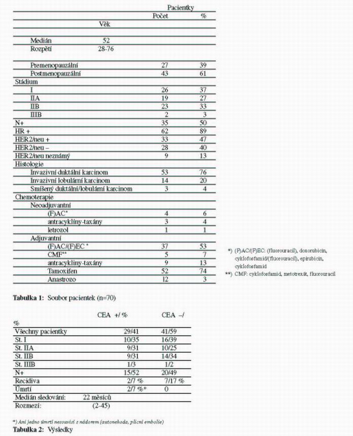 Do projektu byly od června 2001 do října 2004 zařazovány pacientky s primárním karcinomem prsu léčené na Onkologické klinice 1. LF UK a VFN v Praze. Pacientky musely být po radikálním chirurgickém výkonu bez známek onemocnění nebo indikovány k neoadjuvantní terapii s radikálním záměrem. Pacientky byly následně léčeny dle aktuálně platných konsensuálních doporučení ze St. Gallen. Celkem bylo zařazeno 70 pacientek: 26 (37 %) se stádiem I, 19 (27 %) se stádiem IIA, 23 (33 %) se stádiem IIB a 2 (3 %) se stádiem IIIB. Podrobná charakteristika souboru je popsána v tabulce 1. Adjuvantní chemoterapie s antracyklíny, bez antracyklínů nebo s antracyklíny a taxány byla podána 51 (73 %) pacientkám. Z 62 (89 %) pacientek s expresí hormonálních receptorů bylo adekvátní hormonální léčbou léčeno 54 (77%) žen. Zbylých 8 pacientek s pozitivitou hormonálních receptorů bude léčeno adjuvantní hormonální léčbou po dokončení adjuvantní chemoterapie. Devět premenopauzálních pacientek podstoupilo chirurgickou nebo farmakologickou ovariální blokádu. Všechny pacientky po konzervativním výkonu podstoupily nebo podstoupí ozáření prsu. U pacientek, kde byly zjištěny více než 3 infiltrované axilární uzliny bylo indikováno ozáření axily.