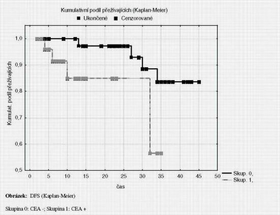 Transkripty CEA byly zjištěny ve vzorcích kostní dřeně 29 (41%) pacientek. Jednalo se od 10 (35%) pacientek stádia I, 9 (31%) pacientek stádia IIA, 9 (31%) pacientek stádia IIB a 1 (3%) pacientku stádia IIIB. Patnáct (52%) pacientek s transkripty CEA v kostní dřeni mělo infiltrované axilární lymfatické uzliny. Nebyly pozorovány statisticky významné korelace mezi expresí CEA v kostní dřeni a ostatními klinickými a patologickými rysy jakou jsou velikost nádoru, počet infiltrovaných axilárních lymfatických uzlin, histopatologický typ, nádorový grading, exprese hormonální receptorů, exprese HER2/neu. Medián doby sledování činil 22 měsíců (2 až 45). Doposud byla zjištěna recidiva u 9 (6%) pacientek, z nichž 2 měly prokázané okultní nádorové buňky v kostní dřeni pomocí CEA. V době analýzy jsme zaznamenali 2 (3%) úmrtí, která neměla vztah k nádoru (dopravní nehoda, plicní embolie). Výsledky jsou přehledně znázorněny v tabulce 2. V rámci hodnocení bezpříznakového období (disease free survival; DFS) byly metodicky jako události hodnoceny vzdálené a lokoregionální recidivy, nenádorová úmrtí, kontralaterální nádory a jiné primární nádory. Při hodnocení DFS (Kaplan-Meier) dochází k separaci křivek s tím, že exprese CEA v kostní dřeni se pojí s kratším DFS (viz obrázek). Nicméně výsledky se pohybují těsně nad hranicí statistické významnosti (p=0,05548, Gehan Wilcoxonův test).