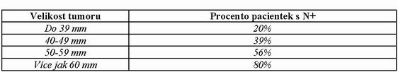 Následující tabulka uvádí pravděpodobnost postižení pánevních lymfatických uzlin v závislosti na velikosti tumoru