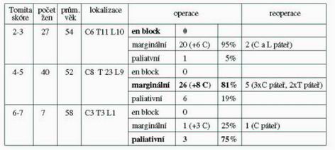 Metastázy do krční páteře jsou vzhledem k vysoké vulnerabilitě a nemožnosti en block resekce posuzovány samostatně. V první skupině, byl paliativní výkon u jedné pacientky indikován vzhledem k věku, marginální intralézionální resekce byly dříve standardním radikálním výkonem. Ve druhé skupině jsme v 6 případech měli volit radikálnější postup, přesto zde nedošlo k lokální recidivě, naopak ve 3. skupině u jedné pacientky byl vzhledem k biologickému věku výkon radikálnější. Tab. 1.
