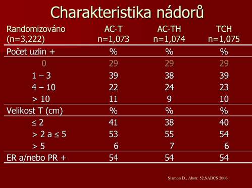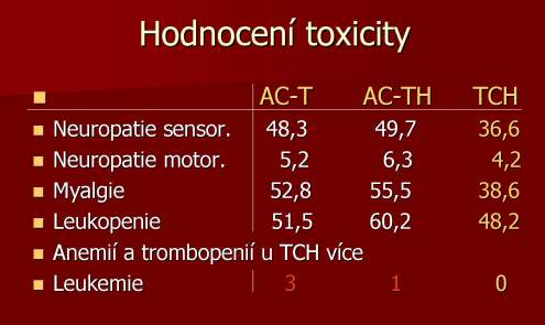 - Režim bez anthracyklinů je při srovnatelném efektu lépe tolerován - méně vedlejších účinků co do četnosti i závažnosti