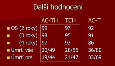 - Rameno TCH dosahuje 34 % redukce rizika smrti (HR 0.66, což je ekvivalentem 52% zlepšení v celkovém přežití), ve srovnání s ramenem AC-T.