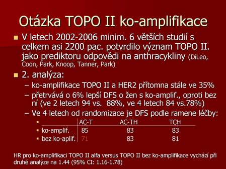 - Nejvýznamnější dlouhou dobu HER2, nyní ale TOPO II alfa (při něm téměř vymizí prediktivní hodnota HER2) – zařadit do kliniky, neboť DOXO jeTOPO II inhibitor a měl by být použit
