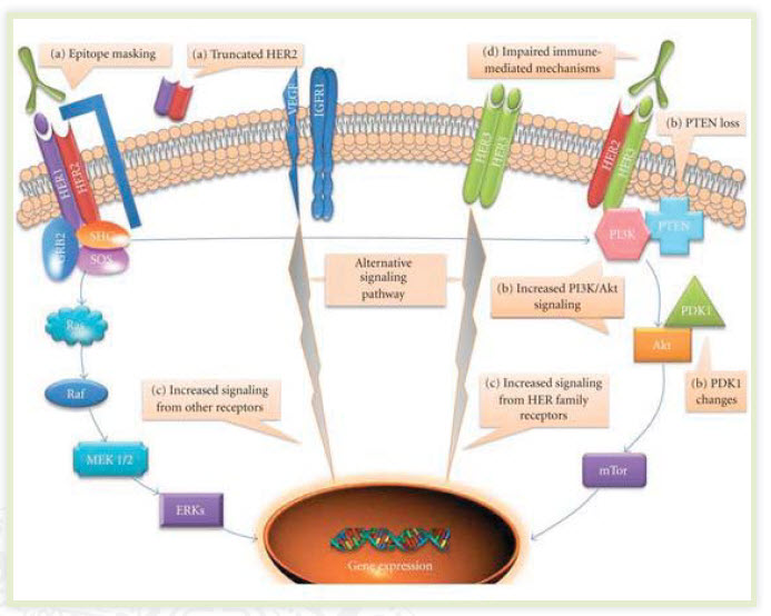 a) Ztráta PTEN – mutací způsobená ztráta tumor supresorového genu PTEN (fosfatáza a tenzin homolog) přítomná zhruba u 50 % pacientek s karcinomem prsu zvyšuje aktivaci PI3K/ATK (fosfatidylinozitol 3-kináza), takže ji trastuzumab není schopen účinně blokovat.