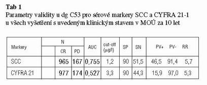 Cílem naší studie bylo posoudit senzitivitu (odrážející správnou pozitivitu) při 90% specificitě, která vyjadřuje správnou negativitu markeru pro sledované parametry. K tomuto vyhodnocení je nezbytná spolupráce ošetřujících lékařů, kteří musí udat klinický stav nemocného (remise či progrese onemocnění), aby bylo možno hodnotit správnou a falešnou pozitivitu i negativitu. Jak uvádí TAB 1 na základě parametrů senzitivity, AUC, RR a dalších, nejvalidnějším markerem této choroby jsme prokázali marker SCC, podobně jak uvádí Doporučení EGTM (Evropské pracovní skupiny pro nádorové markery) z r. 1999, kde je také uveden lead time pro SCC vzhledem k návratu choroby 2-6 měsíců. Při sledování efektu terapie v uvedené studii se také lépe osvědčil SCC. Pras E. (2002) uvádí výsledky sledování markerů SCC a CYFRA 21-1 ve své studii 114 nemocných stadia IB – IV léčených podobným způsobem jako v naší studii. Senzitivitu pro SCC získali 60% a pro CYFRA 21-1 = 46%. Zvýšené hodnoty markerů po skončení terapie indikovaly residuální tumor pro SCC s 92% pravděpodobností, pro marker CYFRA 21-1 se 70% pravdě podobností. T. Ohno (2003) hodnotil SCC jako prediktor odpově di k radioterapii karcinomu č ípku u 63 nemocných. U nemocných, kde při progresi byla hodnota SCC 5-30 ng/ml (senzitivita SCC v souboru byla 74,6%), tam při dosažené kompletní remisi poklesla hodnota SCC o více než 70% po 4 týdnech terapie. Bylo tak možno podle dynamiky SCC během terapie dobře odlišit responderky od málo reagujících nemocných. Výhodou je krátký biologický poločas tohoto markeru. Proto již 1-2 dny po dosažení kompletní remise dochází k jeho normalizaci v krvi. TPS a CEA pro malý počet indikovaných vyšetření nebylo možno statisticky věrohodně zhodnotit.