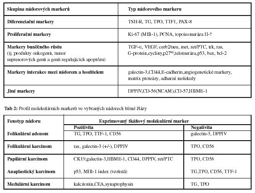 Nejčastější diagnostické a prognostické markery studované dosud v tyreoidálních nodulech (na tkáňových vzorcích nebo aspirátech) jsou sumarizovány v Tab. 1 (Katoh et al 2000, Kholová et al 2002, 2003, 2004, Ludvíková et al 2005, Papotti et al 2005). Distribuce tkáňově a nádorově specifických molekulárních markerů v různých histologických typech tyreoidálních nádorů je uvedena v Tab 2.