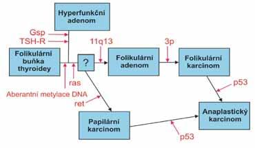 Většina tyreoidálních nádorových markerů odráží různé procesy v nádorové transformaci folikulárních a papilárních karcinomů. Podle vícestupňové teorie karcinogeneze jsou folikulární karcinomy generovány z folikulárních adenomů, zatímco papilokarcinomy jsou odvozeny přímo z transformovaných normálních tyreocytů (Obr. 1 Tallini 2002, Takano 2004).