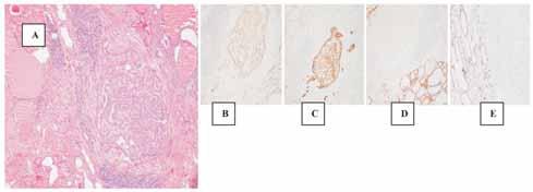 A Nádor má papilární architektoniku a typické jaderné projasnění (hematoxylin&eosin, x200); B Nádorové buň ky vykazují jadernou imunopozitivitu TTF-1 (immunoperoxidase, x200); C Difúzní cytoplazmatická exprese galectinu-3 v nádorových buňkách (ve srovnání s negativitou normálních peritumorálních foliklů štítné žlázy)(immunoperoxidáza, x200); D, E Karcinomové buň ky jsou TPO a CD56 imunonegativní, zatímco nenádorové folikulární buňky jsou silně pozitivní (immunoperoxidáza, x200).