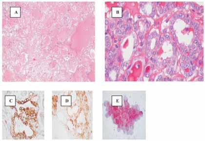 ANádor je složený z nepravidelných foliklů s prořídlým koloidem (hematoxylin&eosin, x100); BFolikly jsou lemovány buňkami se světlými jádry typickými pro papilokarcinom (hematoxylin&eosin, x200); CSilná cytoplazmatická pozitivita nádorových buněk na CK-19 (immunoperoxidáza, x200); D Pozitivita galectinu-3 v nádorových buňkách (immunoperoxidáza, x400). E Aspirát z papilárního karcinomu ukazuje DPPIV pozitivitu (histochemie).