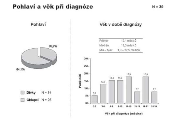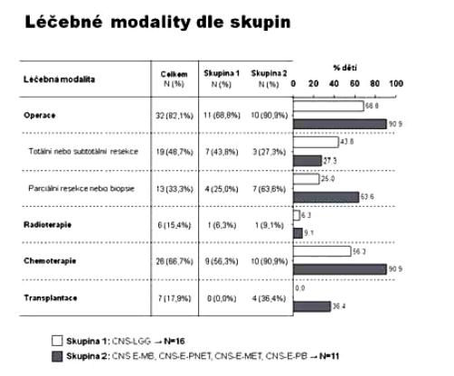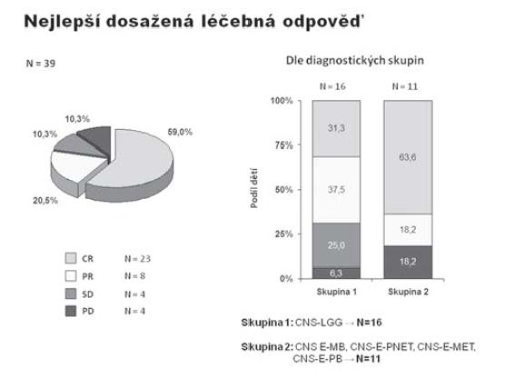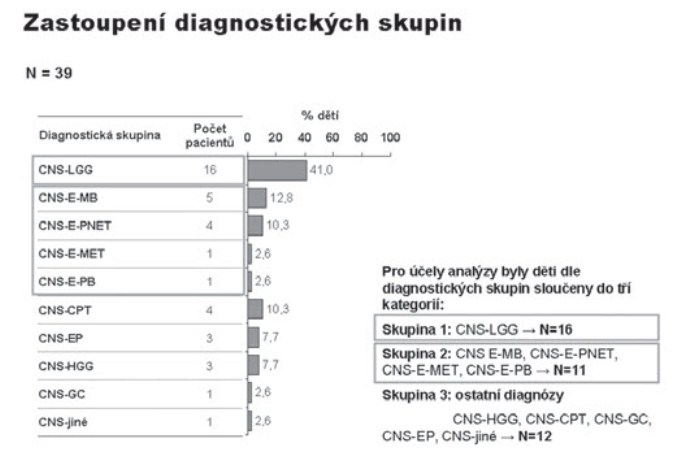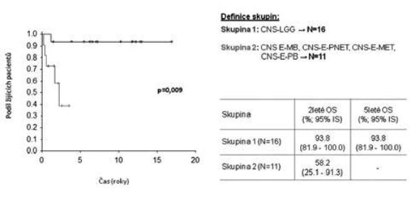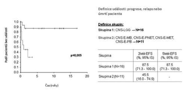 Na Klinice dětské onkologie v Brně jsme v období 1998-2010 ošetřili 386 dětí s diagnózou primárního nádoru CNS, z toho 39 (10 %) dětí bylo v době stanovení diagnózy ve věkové kategorii 0-3 roky, dívky 35,9 % (N=14), chlapci 64,1 % (N=25); medián věku při diagnóze 12 měsíců (obr. 1). Způsob koncepce: přirozená N=29, IVF N=3 (10 %), neznámo (nedohledáno) N=7 případů. Jednotlivé kategorie byly: CNS-LGG (N16=41 %), CNS-EMBRYONÁLNÍ (N11=28,3 %), CNS-CPT (nádory choroi- dálního plexu) 10,3 %, CNS-HGG 7,7 %, CNS-EP (ependymom) 7,7 %, CNS-GC (germ cell tumory) 2,6 %, jiné 2,6 % (obr. 2). Děti jsme léčili pediatrickými protokoly pro příslušnou diagnózu a rizikovou skupinu. Vzhledem k heterogenitě souboru jsme podrobněji analyzovali jen dvě nejpočetnější skupiny CNS-LGG (skupina 1) a CNS-EMBR (skupina 2). Chemoterapie jako léčebná modalita byla užita ve 56,3 % (skupina 1) a 90,9 % (skupina 2) případů, radioterapie v různém rozsahu selektivně pak v 6,3 % (skupina 1) a 9,1 % (skupina 2) případů (obr. 3). Pozitivní léčebná odpověď ve skupině maligních embryonálních tumorů (sk. 2) byla dosažena v 81,8% případů (CR+PR), problém představuje tedy vysoké riziko relapsu/progrese (obr. 4). Byl nalezen statisticky významný rozdíl mezi skupinami 1 a 2 v celkovém přežití ve 2 letech od data diagnózy (OS2): 93,8% (sk. 1) a 58,2 % (sk. 2) /p=0,009 / (obr. 5). Byl potvrzen i statisticky významný rozdíl v přežití bez události 2 roky od data diagnózy (EFS2): 87,5 % (sk. 1) a 45,5 % (sk. 2) /p=0,005/ (obr. 6).