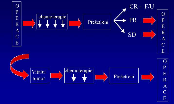 - oddálená operace (2nd look): reziduální tumor po CHT perzistující elevace markerů