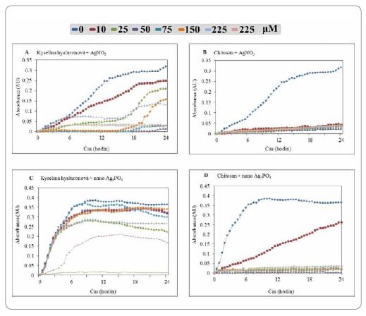 Minimální inhibiční koncentrace (MIC) se u komplexu na-noAg3PO4 s kyselinou hyaluronovou projevila od koncentrace 25 µM (obr. C) a úplná inhibice se projevila pak od 250 µM. MIC komplexu nanoAg3PO4 s chitosanem byla 10 µM, úplná inhibice nastala od 100 µM (obr. D). U komplexu dusičnanu stříbrného s kyselinou hyaluronovou byla MIC 50 µM (obr. A), od 300 µM nastala úplná inhibice. Komplex AgNO3 s chitosanem dosáhl MIC 25 µM (obr. B) a úplná inhibice růstu S. aureus při 300 µM.