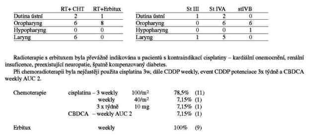 Na našem pracovišti bylo od prosince 2006 do prosince 2008 v rámci indikační onkoORL komise konzultováno 206 nových pacientů - z těchto bylo 83 primárně operováno, 33 následně adjuvantně ozářeno a 11 absolvovalo adjuvantní CHRT. 41 pac. bylo indikováno ke kurátivní RT, 54 k CHRT a 12 CHT/RT+CHT/CHRT. 9 absolvovalo paliativní chemoterapii pro primárně metastatické onemocnění a u 15 pacientů byla doporučena paliativně symptomatická léčba.