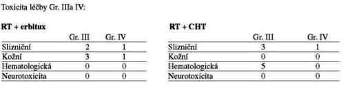 Pro GIT a hematologickou toxicitu gr III u 1 pacienta s cisplatinou bylo nutné měnit CHT režim s CBDCA. U 4 pacientů s chemoterapii v režimu 3 weekly byla aplikace CHT ukončena po 2s pro projevy toxicity léčby (GIT, hemat.). Radioterapie byla dočasně přerušena u 2 pacientů, ale vždy dokončena.