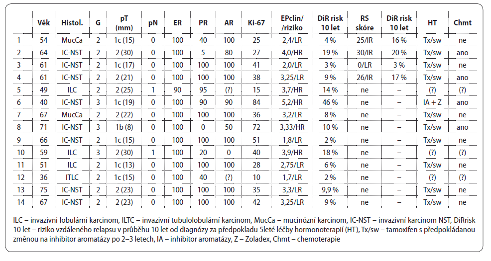 Od května 2015 do ledna 2016 bylo v Laboratoři experimentální medicíny (LEM) v Olomouci vyšetřeno 14 pacientek testem EndoPredict, který byl v naprosté většině případů zakoupen z prostředků LEM, případně byl proplacen zdravotní pojišťovnou. Ve 4 případech byl dodatečně proveden u pacientek, u kterých byl k dispozici nejednoznačný nebo atypický výsledek testu Oncotype DX. Charakteristika souboru viz tabulka.
