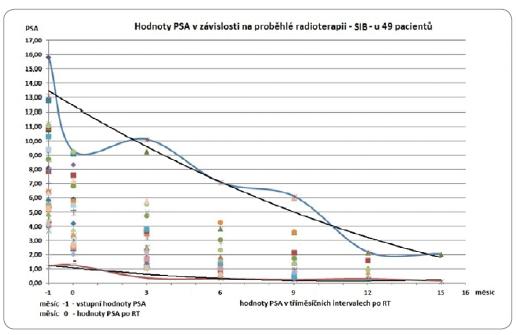 U souboru pacientů se podařilo dodržet námi stanovené toleranční dávky i přiměřenou akutní toxicitu. Při vyhodnocování hladin PSA jsme zjistili příznivý efekt léčby. Viz graf 1.