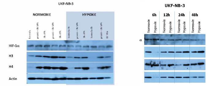 Metodou Western blot nebyla detekována významná změna exprese HIF-1 <x v neuroblastomové buněčné linii UKF-NB-3. Jeho hladina postupně, s dobou kultivace 6-48 hod, klesá. Rozdíl mezi expresí tohoto proteinu při kultivaci za standardních podmínek ve srovnání s hypoxickými kultivačními podmínkami není patrný. Valproát, inhibitor histondeacetyláz, acetylaci histonů H3 a H4 významně zvyšuje jak v normoxii, tak hypoxii. Také samotné kultivační podmínky ovlivňují vlastní acetylaci histonů. Nedostatek kyslíku při kultivaci linie UKF-NB-3 rezultuje ve zvýšení hladiny acetylace histonů H3 a H4. Tento stav může vysvětlovat snahu buněk přizpůsobit se nedostatku kyslíku a exprimovat větší množství proteinů nutných k adaptaci na toto pro buňky nepříznivé prostředí.
