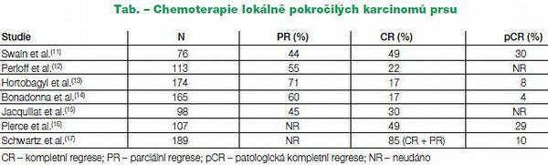 Po podání předoperační chemoterapie bylo v klinických studiích dosahováno 49-93 % objektivních léčebných odpovědí. Při použití chemoterapie s antracykliny a taxany je u neselektovaných pacientek dosahováno 4-30% patologických kompletních regresí (pCR). Tab. č. 1