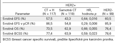 Ve studii byla během mediánu sledování 5,4 let potvrzená prospěšnost trastuzumabu v EFS. Četnost pCR u HER2-dependentních karcinomů byla 43 % v rameni s trastuzumabem a 23 % v rameni se samostatnou chemoterapií (p = 0,02). Tříleté období bez projevů nemoci bylo signifikantně vyšší u nemocných léčených trastuzumabem ve srovnání s chemoterapií (70,1 % vs. 53,3 %; HR 0,56, p = 0,006). Zlepšení celkové doby přežití OS nebylo statisticky signifikantní (85,3 % vs. 80,4 %; HR 0,65; p = 0,18). Tab. č. 2