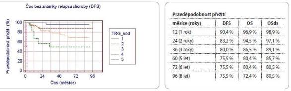 V letech 2001-2009 bylo do souboru zařazeno celkem 201 pacientů, finálně bylo hodnoceno 189 pacientů. Naprostou většinu souboru tvořili pacienti ve III. klinickém stadiu (150, 80 %). Medián doby sledování pacientů od operace byl 33 měsíců. Za tuto dobu zrelabovalo 36 pacientů (19 %), z toho 7 pacientů lokálně (3,7 %) a u 29 pacientů byly zjištěny vzdálené metastázy (15,3 %). Zemřelo 29 pacientů (15,3 %), z toho 7 pacientů v důsledku komplikací léčby (3,5 %). Pětiletého přežití bez známky relapsu onemocnění dosáhlo v našem souboru 75,5 % pacientů, v případě celkového přežití a celkového přežití vztaženého k progresi choroby se jednalo o 80,4 %, resp. 85,7 % pacientů. Nehematologická toxicita stupně G3/4 nastala u 20 pacientů (10 %), jednalo se zejména o kožní toxicity, průjmy, ileózní stavy a alergické reakce. Hematologická toxicita stupně G3/3 nastala u 16 pacientů (8 %). Redukce dávky radioterapie o 20 a více % byla nutná u 8 pacientů (4 %) a redukce dávky cytostatické léčby u 10 pacientů (5 %). Změna strategie chirurgické léčby nastala u 32 pacientů (17 %). U 8 pacientů byla změna pozitivní (bylo možné provést zákrok zachovávající funkční svěrace - LAR/uLAR), u 14 pacientů byla změna negativní (bylo nutné provést amputaci rekta a vytvořit derivační stomii), v případě 10 pacientů změna chirurgického výkonu neměla vliv na založení stomie. Svěrače zachovávající výkon byl proveden u celkem 122 pacientů (65 %).
