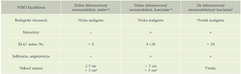 Pretože biologické a klinické vlastnosti nádorov v týchto skupinách bývajú často odlišné, bola v roku 2000 zavedená WHO klasifikácia, ktorá zapracovala modifikáciu názorov na biologické správanie NETov, zaviedla novú terminológiu a pojem klinicko-patologických korelácií s ohľadom na veľkosť nádoru, spôsob jeho rastu a metastázovanie. V roku 2010 bola táto klasifikácia modifikovaná ENETS (European Neuroendocrine Tumour Society) ďalšími údajmi na podklade nových molekulárne biologických poznatkov. (18,19,21) WHO/ENETS klasifikácia je v tabuľke 1.
