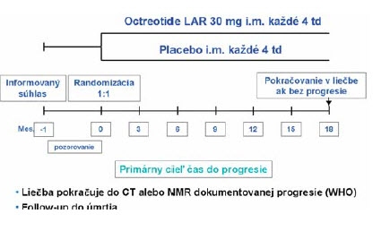 Viac ako 80 % NETov produkuje SSTR. Účinok somatostatínových analógov spočíva v silnej inhibícii uvolňovania mediátorov, takže SSTR signál inhibuje sekréciu a proliferačnú aktivitu. Štúdie protinádorovej aktivity demonštrovali stabilizáciu a parciálnu regresiu v subsetoch pacientov.(27) Nevýhodou predchádzajúcich štúdií bolo chýbanie placebom kontrolovaných štúdií. Naviac aj zaraďovanie heterogénnej populácie pacientov rozdielneho pôvodu a biologickej povahy nedávali jednoznačnú odpoveď. Väčšina štúdií nezaradila naivných pacientov. Nezodpovedané otázky riešila klinická štúdia PROMID. Išlo o randomizovanú dvojito-slepú placebom kontrolovanú štúdiu fázy III B, na ktorej sa zúčastnilo 18 centier v Nemecku. Primárnym cieľom štúdie bol čas do progresie a sekundárnym cieľom liečebná odpoveď, prežívanie, biochemická odpoveď, kontrola symptómov kvality života a bezpečnosti. Dizajn štúdie je na obrázku 2.