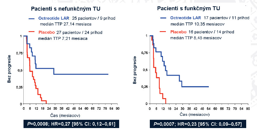 Z výsledkov štúdie (obrázky 3,4) je zrejmé, že oktreotid LAR 30 mg signifikatne zlepšuje čas do progresie u pacientov s metastatickým midgut dobre diferencovaným NETom. Dokumentovaná bola 67% redukcia rizika progresie bez ohľadu na funkčný stav.