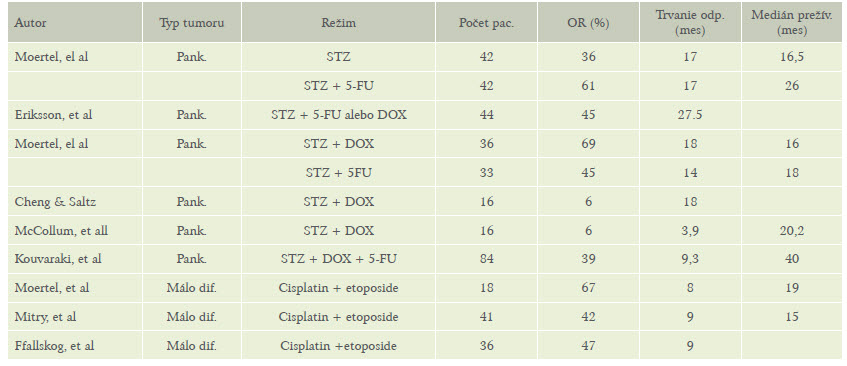 Dáta o chemoterapii sú neuspokojivé. Najlepšia odpoveď sa dosahuje u nádorov nízko diferencovaných, ktoré nemajú somatostatinové receptory a nemajú hormonálnu nadprodukciu. Tieto nádory odpovedajú na chemoterapiu až v 70 % s celkovou dĺžkou odpovede na 8-10 mesiacov. Historicky boli režimy streptozotocín a doxorubicin napriek toxicite akceptované ako štandardná liečba bez dokumentácie zlepšenia intervalu bez progresie alebo prežívania v porovnaní s najlepšou podpornou starostlivosťou (best suportive care). (8,14,21) Neexistuje odporúčanie v prípade zlyhania chemoterapie.