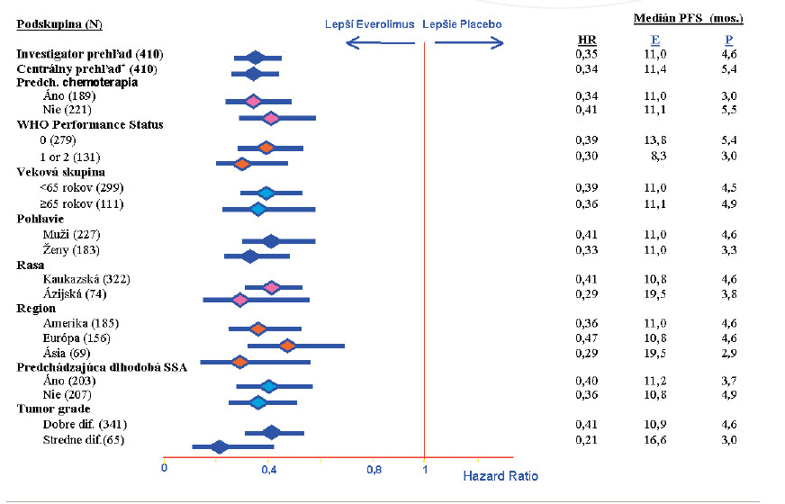 Výsledky liečby ukazuje obrázok 5, liečba everolimom signif katne zvyšuje medián prežívania bez progresie o 6,4 mesiacov (4,6 vs. 11 mes.), redukuje riziko progresie o 65 % oproti placebu. 18 mesiacov času do progresie poukazuje na dlhodobý benefit everolimu. Bezpečnostný profil lieku je akceptovateľný. Radiant 3 je najväčší a najširšie koncipovaný randomizovaný trial pacientov s progredujúcim pokročilým pNETom. Tieto dáta podporili zaradenie everolimu do štandardnej liečby progredujúcich pokročilých pNETov. Naviac sa potvrdilo, že ani predchádzajúce ani konkomitantné užívanie somatostatinových analógov neovplyvňuje liečebné účinky everolimu.(29,31)