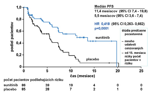 Pre pokročilý dobre diferencovaný pNET máme dnes k dispozícii aj ďalšie možnosti liečby inhibítorom tyrozinkináz – sunitinibom. V dvojitej zaslepenej randomizovanej klinickej štúdii fázy III (sunitinib vs. placebo) bolo zaradených 171 pacientov. Primárnym cieľom bol čas do progresie.(10) Miera objektívnej odpovede sa hodnotila podľa RECIST kritérií a celkové prežívanie bez progresie dokumentuje obrázok 6.
