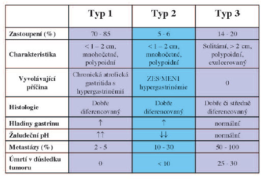 Neuroendokrinní nádory (NET) žaludku lze rozdělit do 3 základních skupin. Typ 1 (70-85 % případů), vzniká na podkladě hypergastrinémie při chronické atrofické gastritidě. Jde o dobře diferencovaný neuroendokrinní nádor či karcinom, s drobnými, mnohočetnými nádory, jejichž riziko metastazování je velmi nízké. Typ 2 vzniká při hypergastrinémii v důsledku gastrinomu (cca 5 %), metastazuje cca ve 20 % případů. Nejmalignější formou NET žaludku je typ 3, který je zastoupen v 15-20 %, jde o dobře či středně diferencovaný neuroendokrinní karcinom. Hladiny gastrinu jsou zde normální či jen lehce zvýšené. Metastázy jsou v době diagnózy přítomny u 75 % případů.