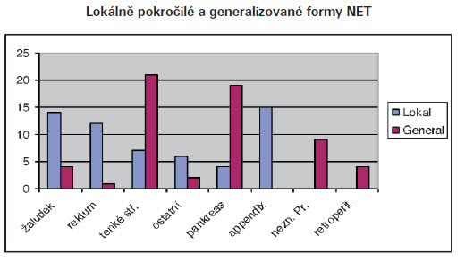 Prezentovaná práce ukazuje dva podsoubory nemocných s neuroendokrinními tumory žaludku. Typ 1, vzniklý pod vlivem hypergastrinémie na podkladě chronické atrofické gastritidy, má nízký maligní potenciál. Přežívání je dlouhodobé. Vykazuje významně nižší hodnotu NSE v porovnání s typem 3, ale významně vyšší hladinu gastrinu. U typu 3 byla zjištěna významně vyšší hladina NSE, prakticky normální hladina gastrinu. Jde o značně maligní nádor, se špatnou prognózou, léčení je chirurgické, v úvahu přichází multimodální paliativní léčba včetně chemoterapie.