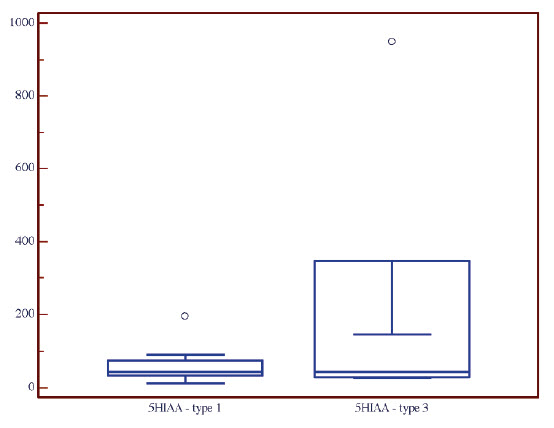 Biochemie: V podsouboru s typem 1 byly hodnoty mediánu 5-hydroxyindoloctové (5-HIAA) 43,7 umol/den (norma do 50 umol/den), u podtypu 3 činil 44,2 umol/den tento rozdíl není dle Mann-Whitneyova testu významný (p = 0,67).