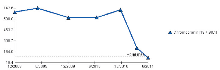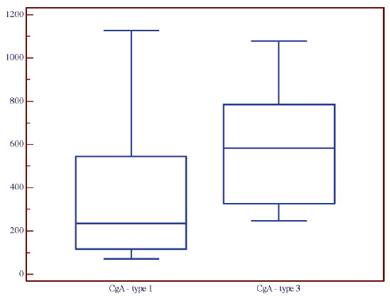 Medián sérového chromograninu A u typu 1 byl 234,5 ng /ml (norma do 98,1), u typu 3 byl 590,2 ng/ml. Rozdíl není statisticky významný, p hladina 0,16