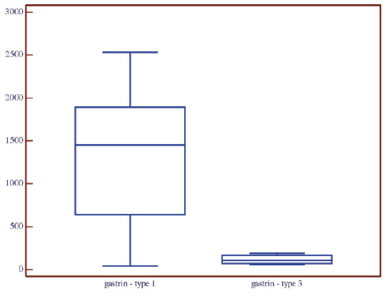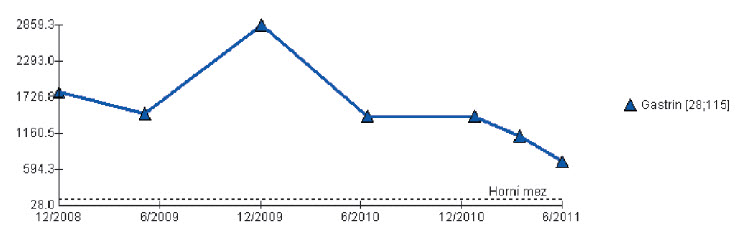 Statisticky významný rozdíl byl však zjištěn u gastrinu, medián 1450 mU/l (norma do 115), u typu 3 byl medián hodnot gastrinu prakticky v normě, konkrétně 118,2, p = 0,039.