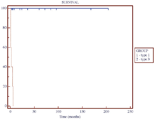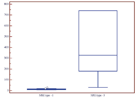 Významný rozdíl jsme prokázali u neuron-specifické enolázy (NSE). U typu 1 byl medián NSE 11,5 (norma do 16 ug/ml), u typu 3 činil 328. Rozdíl je statisticky vysoce významný, na p = 0,0016.