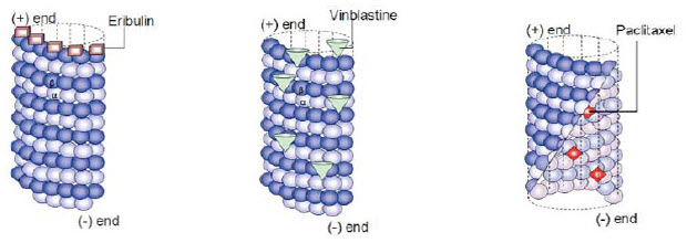 Terčovou strukturou některých cytostatik je buněčný mikrotubulární systém. Mikrotubuly jsou polymery vytvořené z proteinů α-tubulinu a β-tubulinu, které jsou součástí cytoskeletu v cytoplazmě buňky. Mikrotubuly mají klíčovou úlohu pro správnou migraci chromozomů při mitóze, podílejí se též na udržení tvaru buňky, na buněčné motilitě a na přenosu signálů mezi povrchovými membránovými receptory a jádrem. Za normálních okolností je polymerizace a depolymerizace tubulinu v rovnováze.(3) Mezi cytostatika zasahující mikrotubulární systém patří taxany (paklitaxel a docetaxel), vinka alkaloidy (vinorelbin a vinblastin) a epothilony (ixabepilone). Mitotické inhibitory (vinorelbin, vinblastin) se váží na mikrotubulární proteiny, a způsobují tak rozpad struktury mitotického vřeténka (inhibice polymerizace). Inhibitory depolymerizace (paklitaxel, docetaxel) urychlují tvorbu mikrotubulů a stabilizují vytvořené mikrotubuly. Ovlivněním dynamiky mikrotubulů způsobují zástavu buněčného cyklu a apoptózu. Mezi cytostatika též narušující rovnováhu mikrotubulárního aparátu patří jedno z mála nových cytostatik zavedených v poslední době do klinické praxe – eribulin. Eribulin inhibuje formaci dělícího vřeténka, váže se na konce mikrotubulů, a způsobuje tak ireverzibilní mitotický blok. Eribulin inhibuje mikrotubuly mechanismem odlišným od ostatních molekul cílených na mikrotubuly. Váže se na malé množství vysokoafinitních míst na konci mikrotubulů. (4)