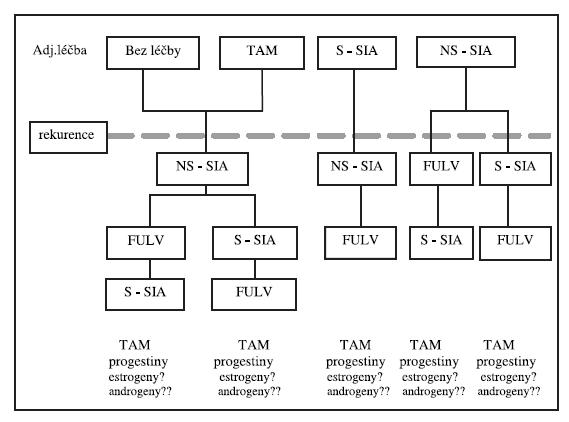 Důkaz o účinnosti kombinace hormonální léčby a cílené biologické léčby (trastuzumab, lapatinib) při koexpresi hormonálních receptorů a HER-2 byl podán ve dvou klinických studiích (Johnston S, Pippen J Jr, Pivot X, et al: JCO 2009. Kaufman B, Mackey JR, Clemens MR, et al: JCO 2009). Zařazení biohormonální léčby do algoritmu léčby metastazujícího onemocnění bude diskutováno. Možné sekvence hormonální léčby metastazujícího onemocnění u postmenopausálních žen jsou na obrázku.
