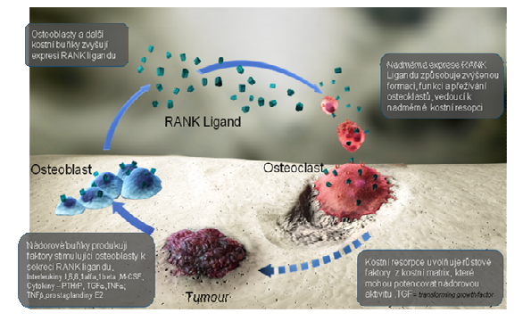 Kostní tkáň je stále v průběhu života přebudovávána dle potřeb těla. Udržuje se stálá rovnováha mezi osteoblasty a osteoklasty. Metastázy různých nádorů nám významně narušují tuto přirozenou rovnováhu v tomto kostním regionu tím, že produkují své působky a posunují rovnováhu na svou stranu. Za zásadní články jsou považovány: RANKL (receptor activator of nuclear factor kappaB ligand) jako rozhodující mediátor podporující diferenciaci, činnost a přežívání osteoklastů, který je produkován stimulovanými osteoblasty a vlivem interakce s mateřským receptorem RANK-osteoklastů dochází k jejich aktivaci, k transformaci a vytváření aktivních vyzbrojených mnohojaderných osteoklastů, schopných masivní osteolýzy. Fysiologicky tento proces blokuje osteoprotegerin, který vyváže RANKL dříve, než se dostane k svému mateřskému receptoru a nedojde tedy k plné aktivaci uvedené dráhy.