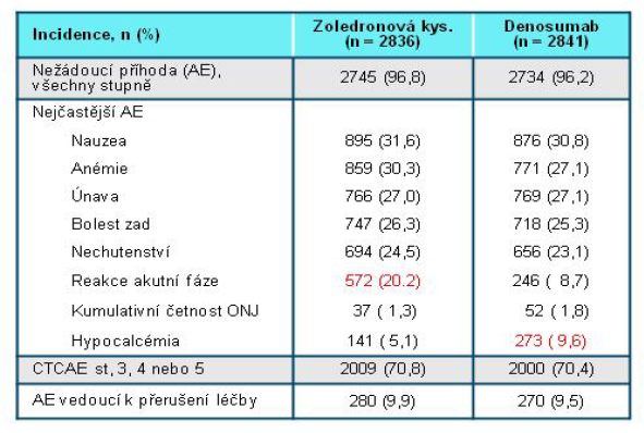 Výskyt diskutované osteonekrósy čelisti byl v těchto studiích (1,8%) nepatrně vyšší jako pro kyselinu zoledronovou (1,3%). O 57% byl nižší výskyt reakcí akutní fáze oproti kyselině zoledronové, hypokalcémie se vyskytovala častěji u denosumabu (9,6%) vs. kyselina zoledronová (5.1 %) a nebyla spojena se symptomy nebo klinickými důsledky, denosumab neměl vliv na renální funkce a nebyla u něj požadována úprava dávky. Při analýze ze všech studií nebyl opět prokázán významný statistický rozdíl oproti kyselině zoledronové.