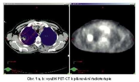 Pro určení GTV je velkým přínosem u NSCLC využití PET-CT. PET-CT zpřesňuje i stanovení stadia, u 20% pacientů detekcí vzdálených metastáz posunuje klasifikaci do stadia IV. Je signifikantně přesnější pro průkaz metastaticky postižených uzlin v mediastinu než CT. Senzitivita PET v porovnání s CT je 0,79 vs 0,60 a specificita je 0,91 vs 0,77. PET-CT umožňuje redukci GTV u 15-30% pacientů a naopak brání opominutí postižených mediastinálních uzlin u 10-25% pacientů (obr. 1). Výrazně snižuje variabilitu zakreslení GTV různými lékaři.